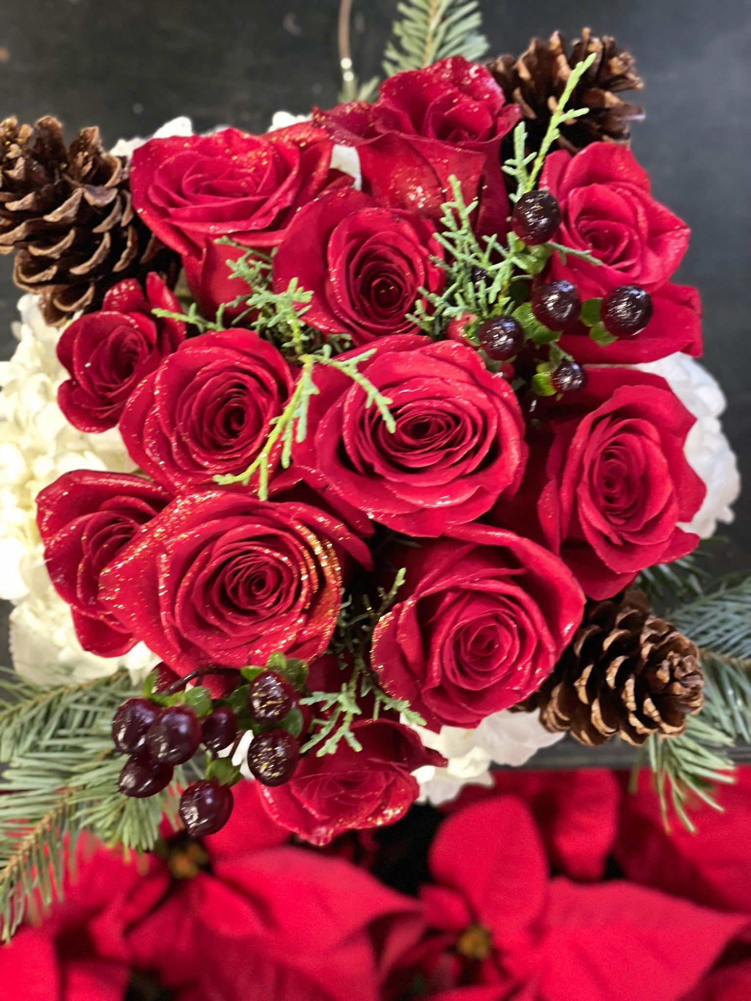 - Dazzling Red Roses: A striking display of a dozen (12) vibrant red roses, elegantly dusted with a delicate gold glitter for a touch of seasonal shimmer.