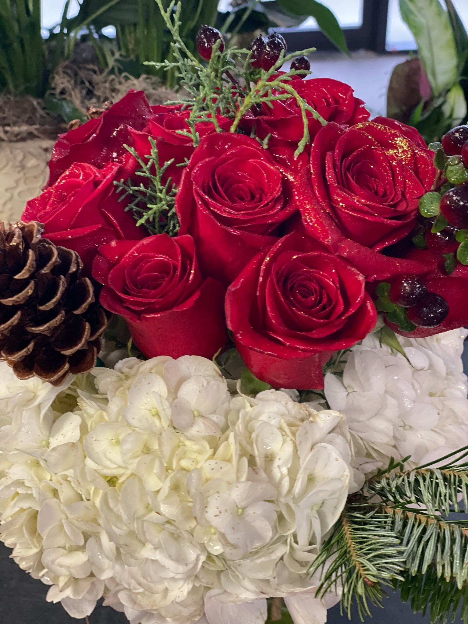 - Lush White Hydrangeas: Soft, full white hydrangeas provide a lush, "snowy" base that contrasts beautifully with the deep red roses.
